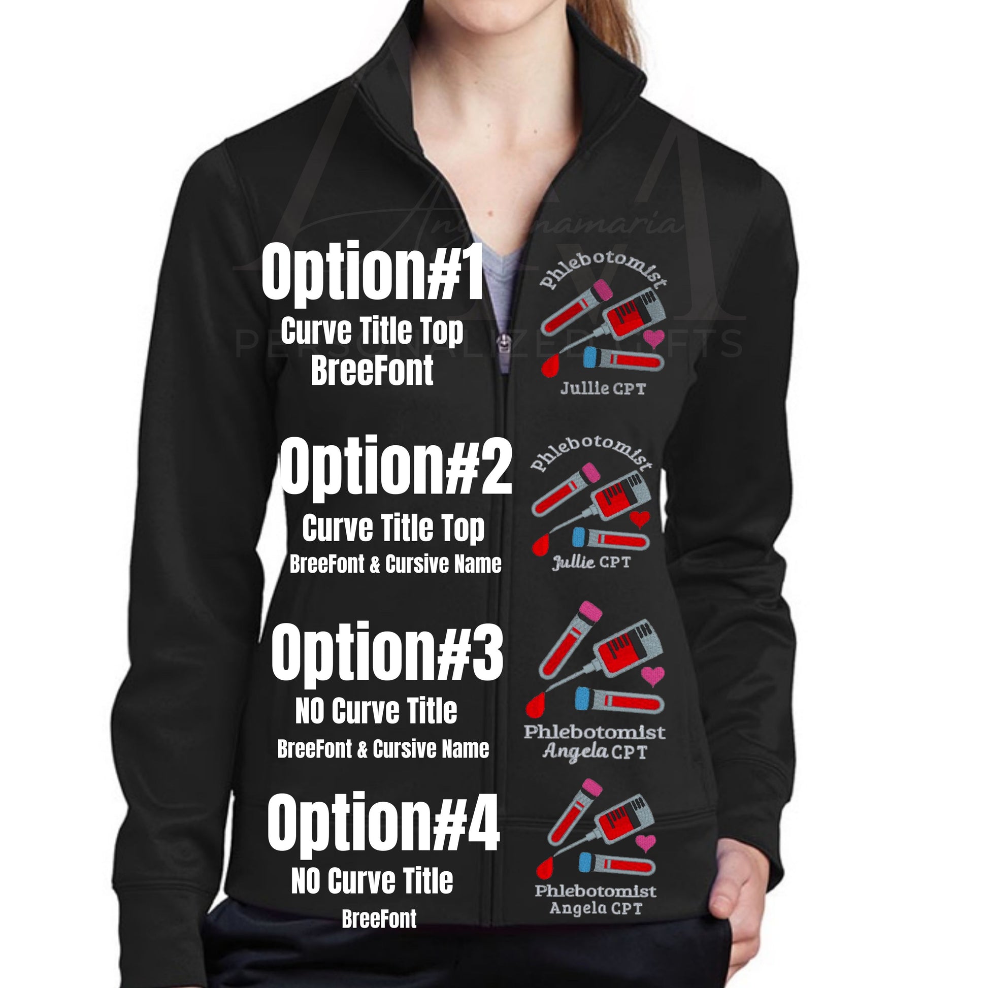 Phlebotomist Blood Tubes Embroidery Design Jacket has a smooth exterior made with Polyester and a soft fleece interior. Perfect weight for wearing anytime with a full zipper. It’s a perfect weight for layering indoors in a clinical atmosphere. Additionally, this jacket is stretchy and fits true to sizing. Reference the Sizing Chart for correct sizes please measure yourself, make sure to double check the names once received I will process and there will be no REFUNDS due to the item being custom made. You may change the Font option for the names ONLY the curve Titles will remain the same if you don't specified it will be the Standard Bree Font like the Sample Picture.CARE INSTRUCTIONS: Machine wash cold. Do not bleach. Tumble dry low remove pro