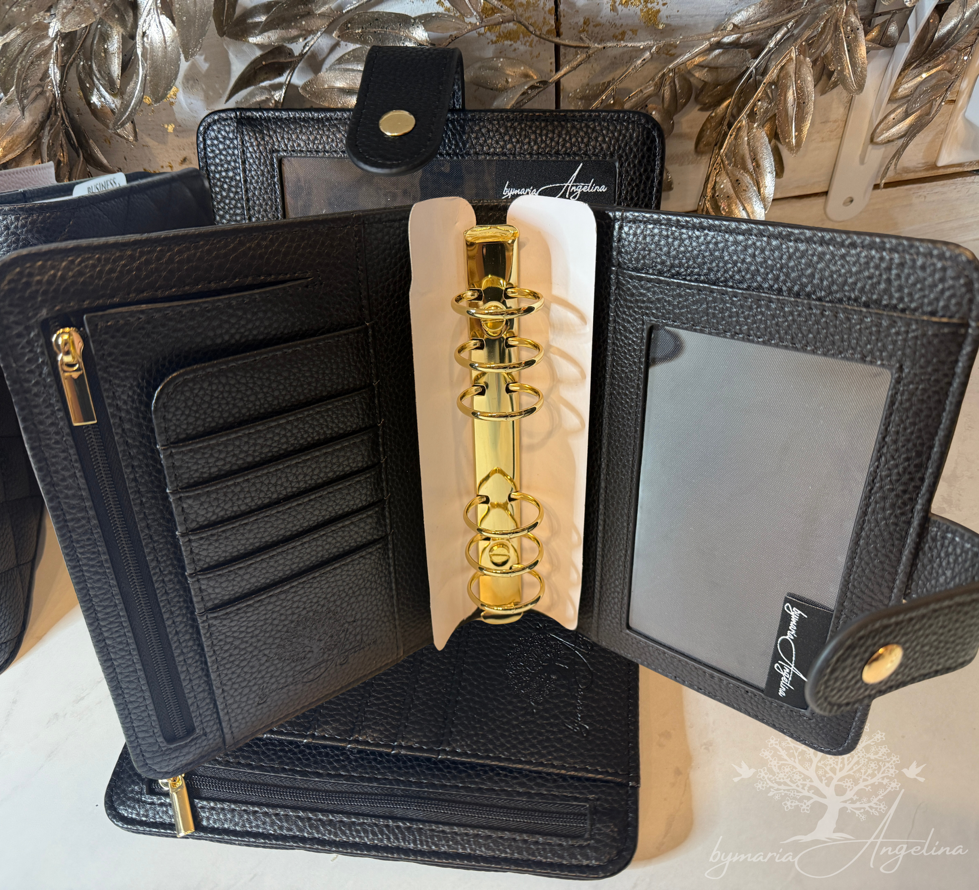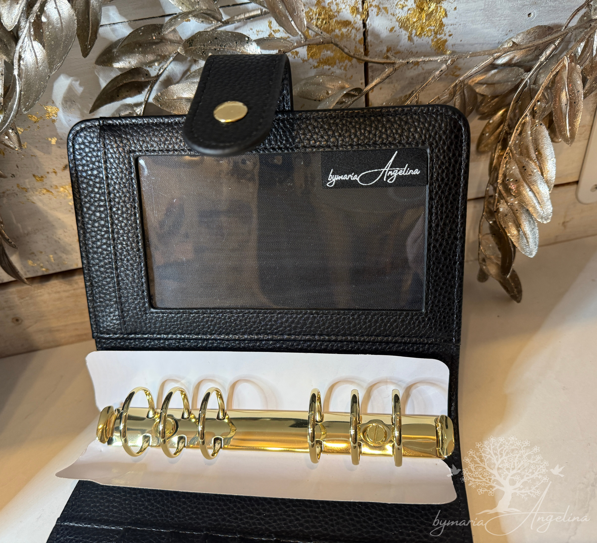 Stay stylish and organized with this sleek A6 black binder featuring elegant 30 mm gold rings, Designed for planner lovers, it includes multiple additional pockets—perfect for storing your cards, and the extra leaf helps keeps more cards or decor and all the essentials you need on the go. Durable, functional, and chic, it's the perfect addition to your planning system. You can use as wallet as well, have you cash envelopes ready to go.