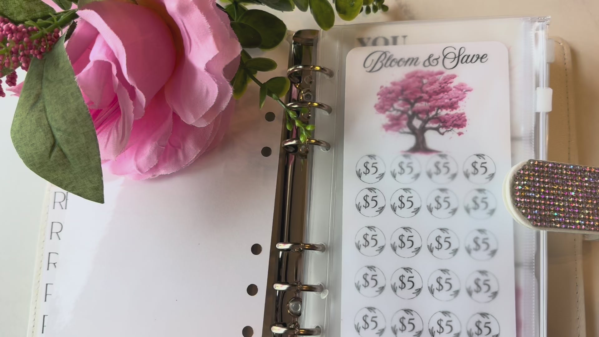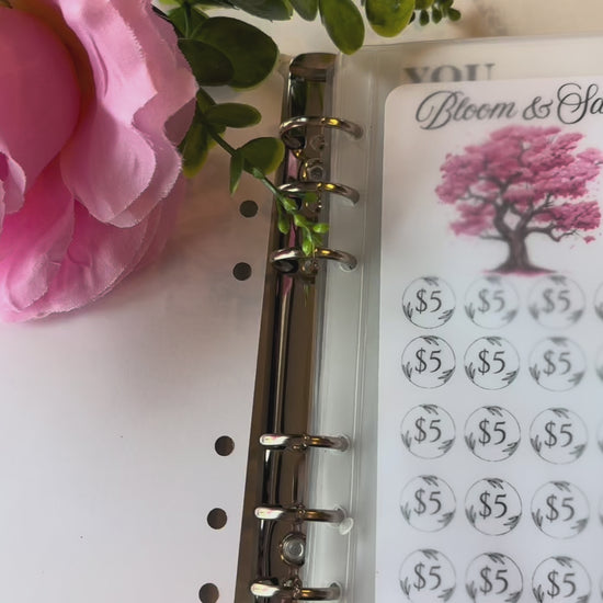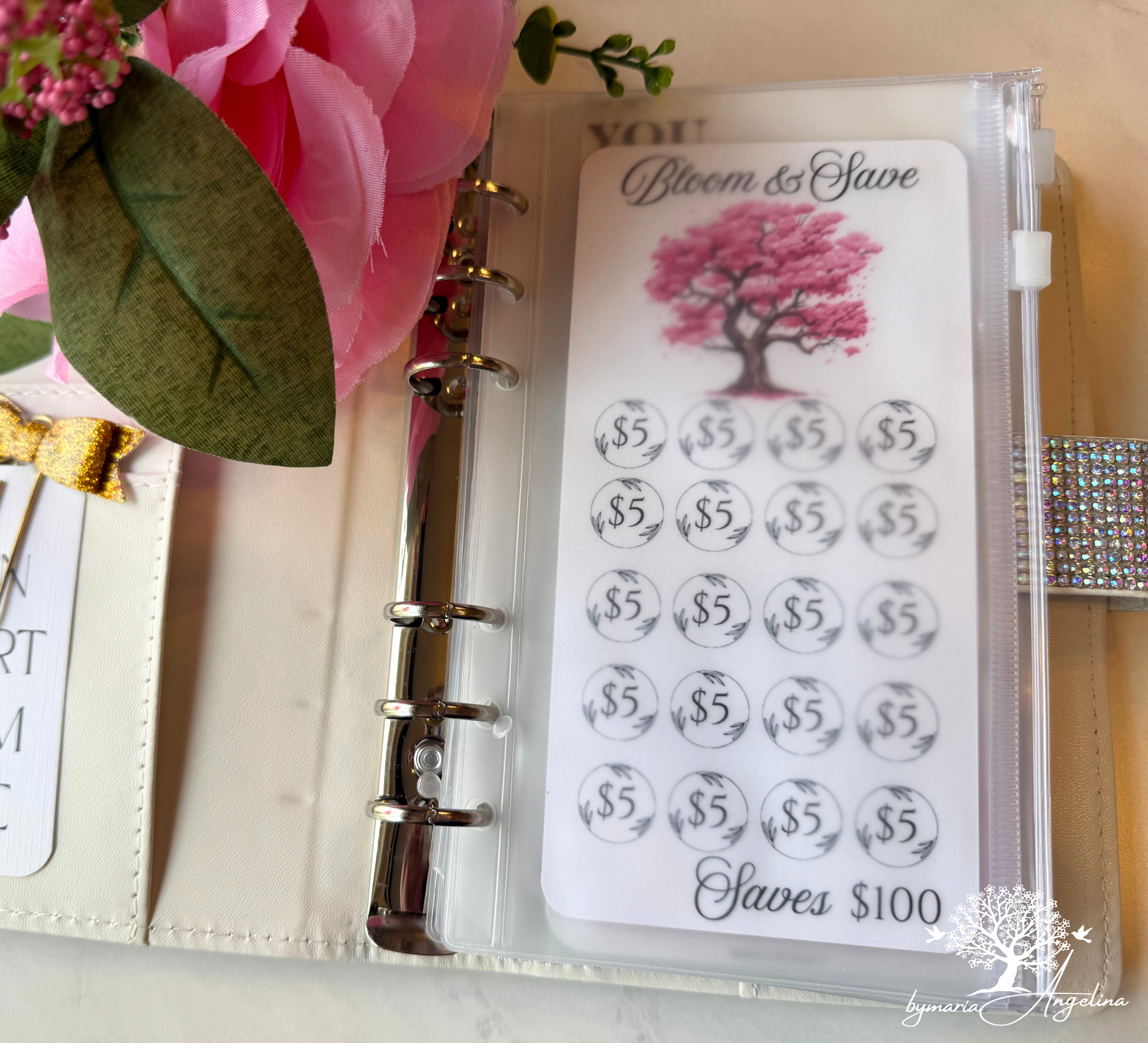 Pink Blossom Tree | Laminated A6 Savings challenge | Planner inserts | 100 Savings Challenge so much fun it makes more exciting to save, Laminated card 5 mil with clear laminate finish, which makes this challenge usable again and again. Measures approximately 6.3”x3.2”, You may also purchase the A6 Cash Frosted Zipper Envelope.